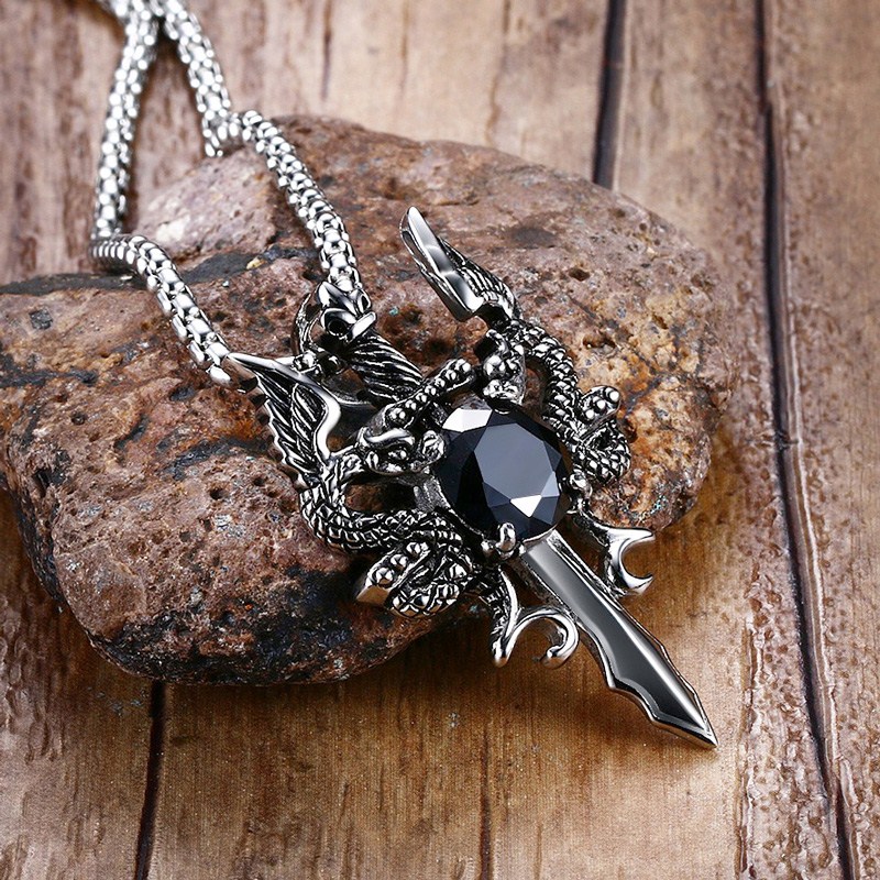 Mens Necklaces, Stainless Steel Double Dragon Cross Sword Pendant Necklace for Men Vintage Punk Animal Bike Jewelry – Sumsfashion