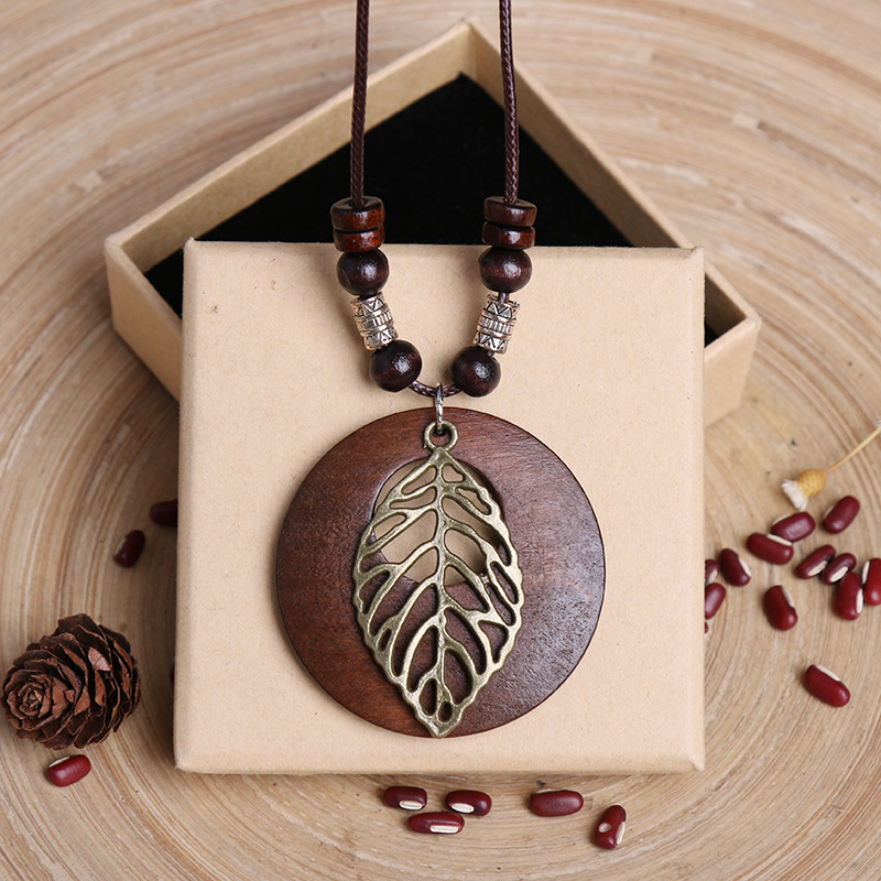 Vintage Wooden Owl Leaf Pendant Necklace Boho Ethnic Style Metal Hollow Leaves Necklaces Long Wax Rope Chain for Women Gifts Style1 – Sumsfashion
